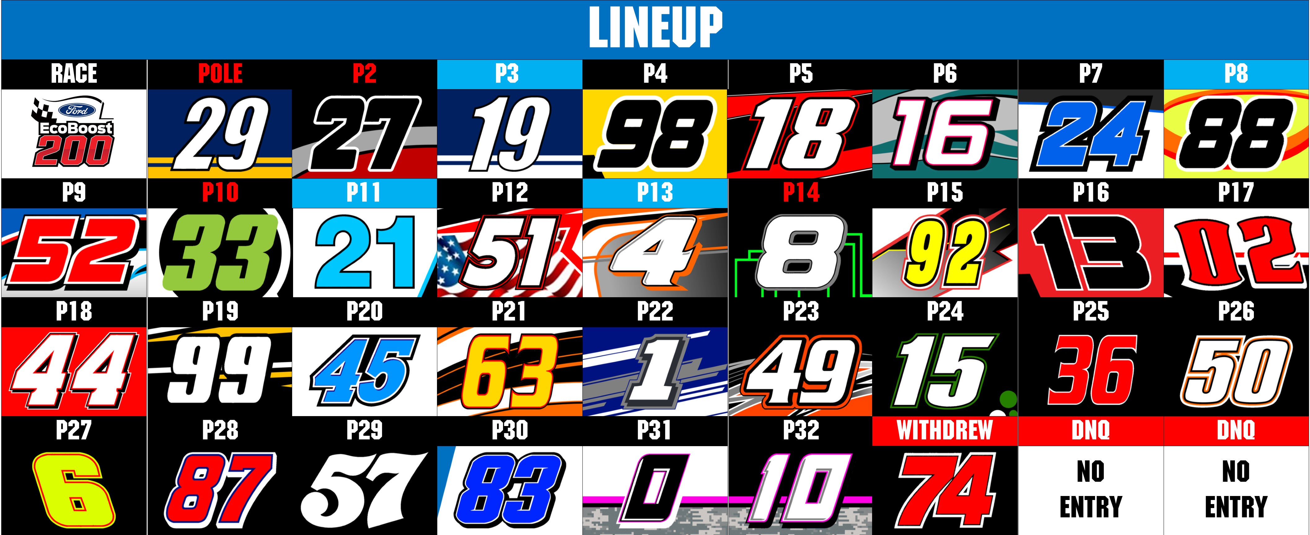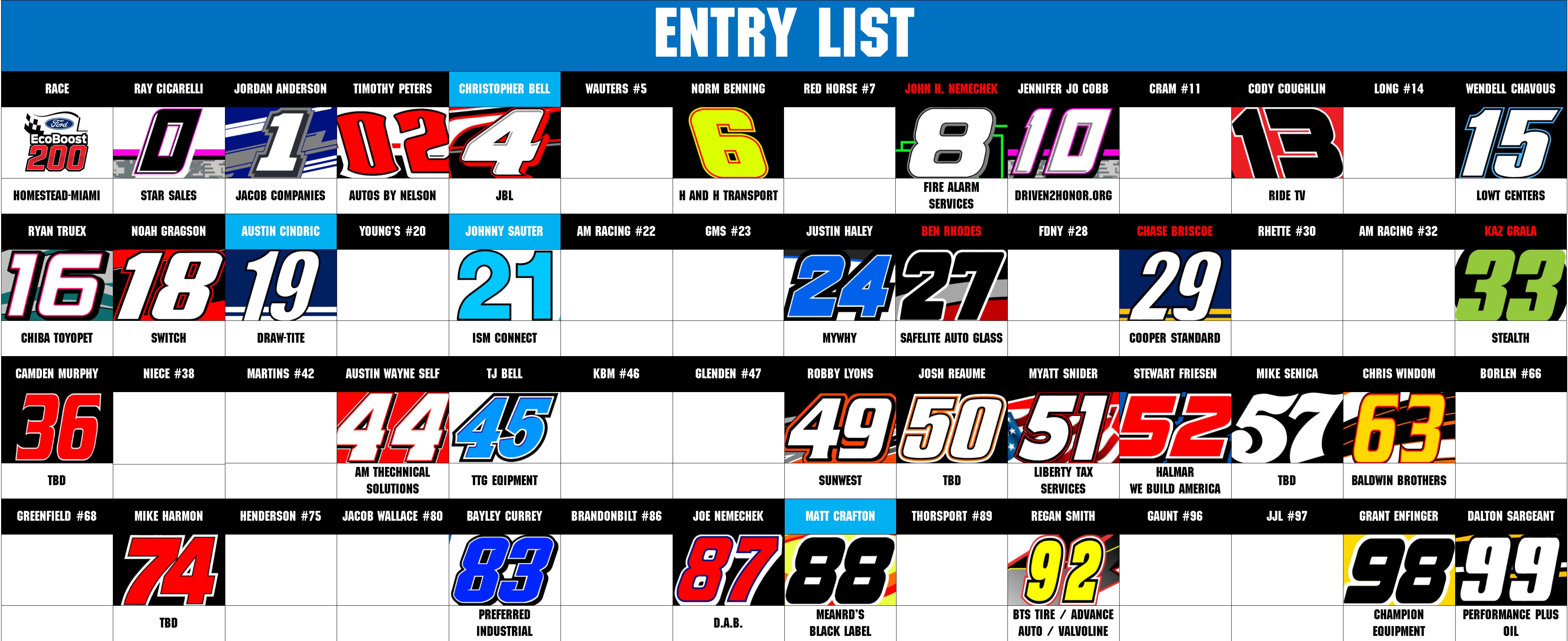 PLAYOFF CONTENDERS NOTED BY LIGHT BLUE HEADERS, ELIMINATED DRIVERS NOTED BY RED HEADER TEXT