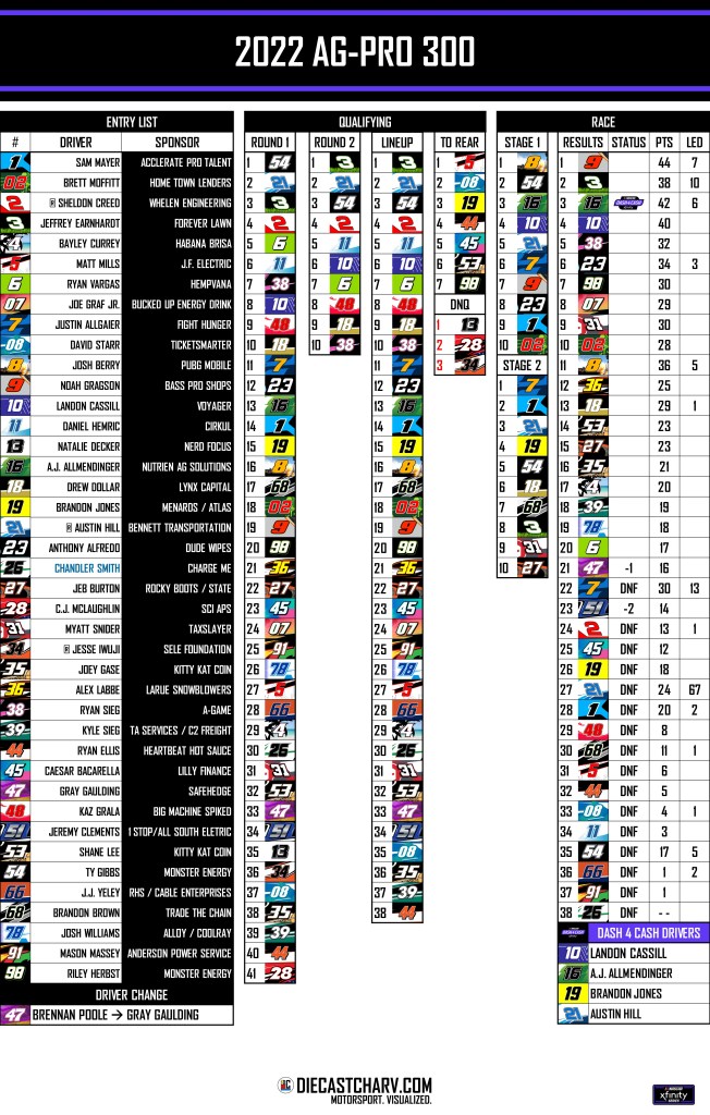 2022 AG-PRO 300 PRACTICE NONE QUALIFYING FRIDAY, APRIL 225:30PM ET ON FS1TWO ROUNDSSINGLE CAR RACE SATURDAY, APRIL 234:00PM ET ON FOX113 LAPS Share this: Share on X (Opens in new window) X Share on Facebook (Opens in new window) Facebook Share on Reddit (Opens in new window) Reddit Like Loading...