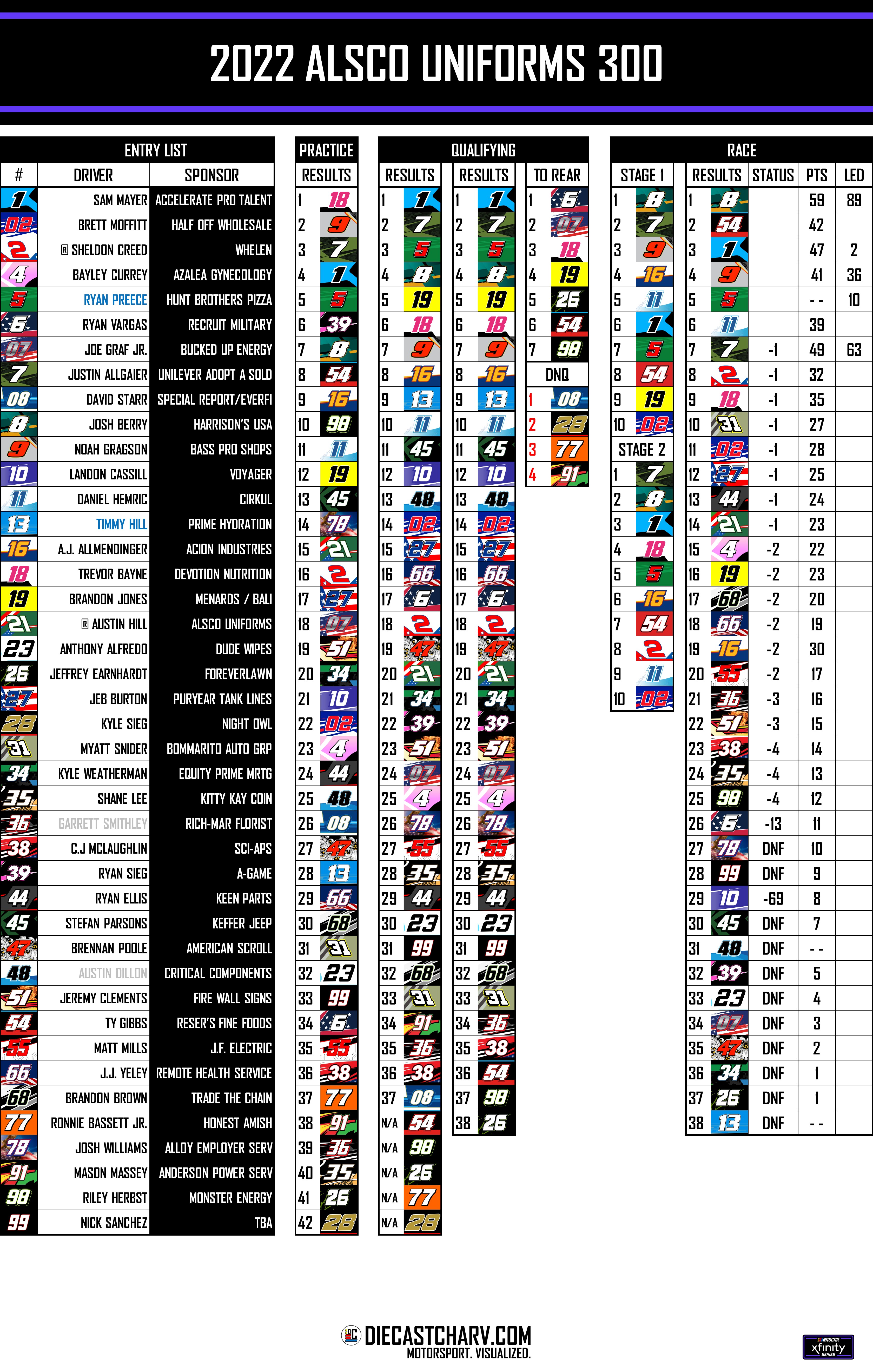 2022 ALSCO 300 AT CHARLOTTE PRACTICE FRIDAY, MAY 273:30PM ET ON FS120 MINUTES QUALIFYING FRIDAY, MAY 274:00PM ET ON FS1SINGLE CAR LAPS RACE SATURDAY, MAY 281:00PM ET ON FS1200 LAPS Share this: Share on X (Opens in new window) X Share on Facebook (Opens in new window) Facebook Share on Reddit (Opens in new window) Reddit Like Loading...
