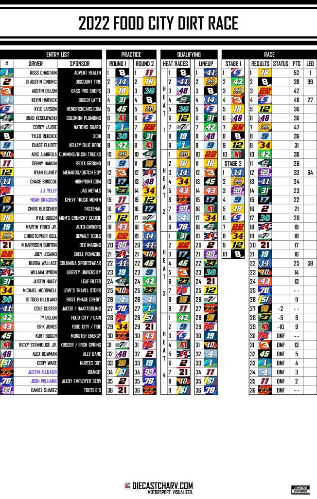 2022 FOOD CITY DIRT RACE PRACTICE FRIDAY, APRIL 154:05PM ET ON FS150 MINUTES FRIDAY, APRIL 156:35PM ET ON FS150 MINUTES QUALIFYING SATURDAY, APRIL 166:00PM ET ON FS24 HEAT RACES RACE SUNDAY, APRIL 177:00PM ET ON FOX250 LAPS Share this: Share on X (Opens in new window) X Share on Facebook (Opens in new window) Facebook Share on Reddit (Opens in new window) Reddit Like Loading...