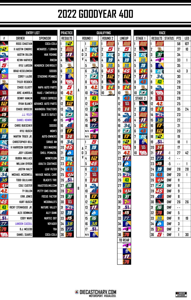 2022 GOODYEAR 400 PRACTICE SATURDAY, MAY 710:30AM ET ON FS120 MINUTES QUALIFYING SATURDAY, MAY 711:05AM ET ON FS1TWO ROUNDSTWO GROUPS ROUND 1GROUP QUALIFYING RACE SUNDAY, MAY 83:30PM ET ON FS1293 LAPS Share this: Click to share on X (Opens in new window) X Click to share on Facebook (Opens in new window) Facebook Click to share on Reddit (Opens in new window) Reddit Like Loading...