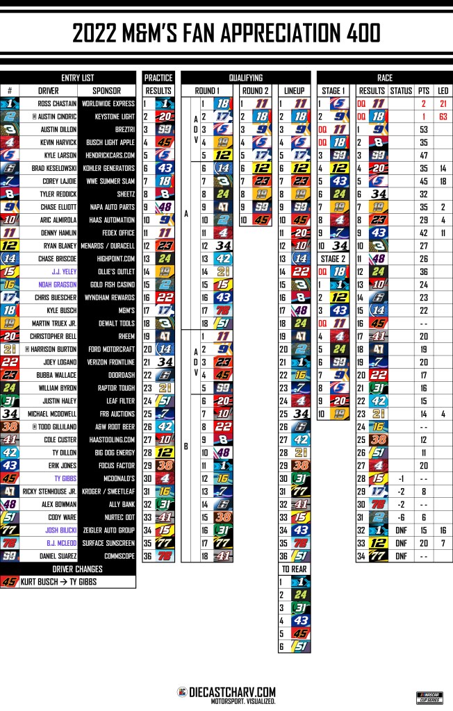2022 M&M’S FAN APPRECIATION 400 PRACTICE SATURDAY, JULY 232:35PM ET ON USA20 MINS QUALIFYING SATURDAY, JULY 233:20PM ET ON USATWO ROUNDSTWO GROUPS ROUND 1SINGLE CAR LAPS RACE SUNDAY, JULY 243:00PM ET ON USA160 LAPS Share this: Share on X (Opens in new window) X Share on Facebook (Opens in new window) Facebook Share on Reddit (Opens in new window) Reddit Like Loading...