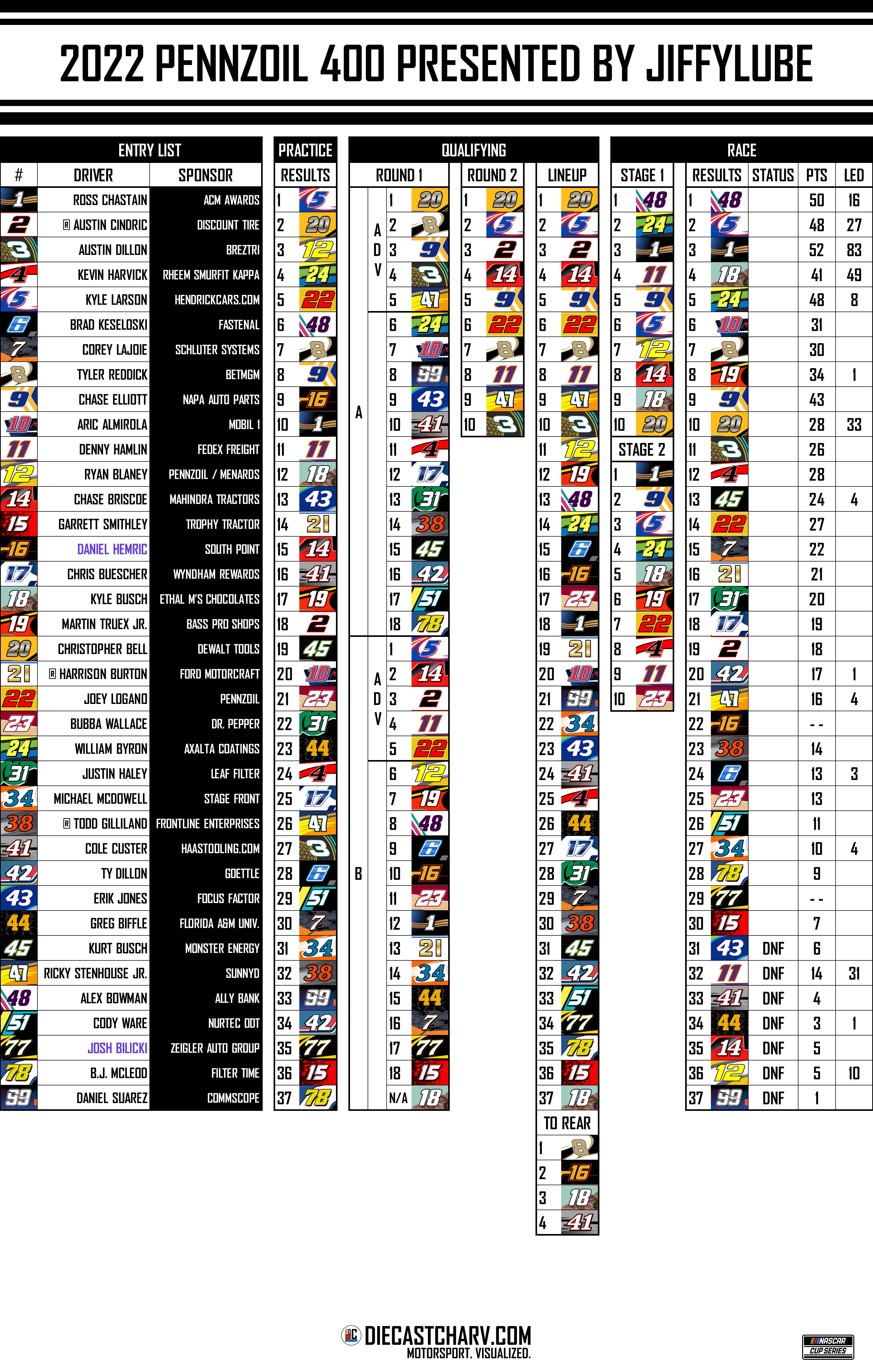 2022 PENNZOIL 400 PRESENTED BY JIFFYLUBE PRACTICE SATURDAY, MARCH 51:30PM ET ON FS235 MINUTES QUALIFYING SATURDAY, MARCH 52:05PM ET ON FS1TWO ROUNDSTWO GROUPS ROUND 1SINGLE CAR LAPS RACE SUNDAY, MARCH 63:30PM ET ON FOX267 LAPS Share this: Share on X (Opens in new window) X Share on Facebook (Opens in new window) Facebook Share on Reddit (Opens in new window) Reddit Like Loading...