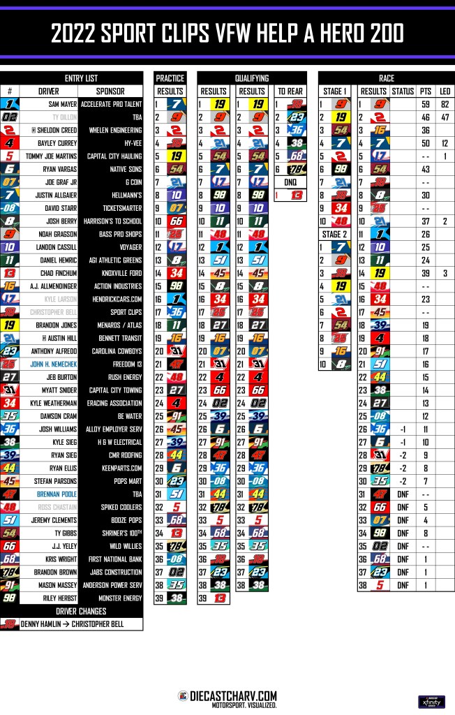 2022 SPORT CLIPS VFW HELP A HERO 200 PRACTICE SATURDAY, SEPTEMBER 310:05AM ET ON NBCSPORTS APP20 MINS QUALIFYING SATURDAY, SEPTEMBER 310:35AM ET ON NBCSPORTS APPTWO ROUNDSSINGLE CAR LAPS RACE SATURDAY, SEPTEMBER 33:00PM ET ON USA147 LAPS Share this: Share on X (Opens in new window) X Share on Facebook (Opens in new window) Facebook Share on Reddit (Opens in new window) Reddit Like Loading...