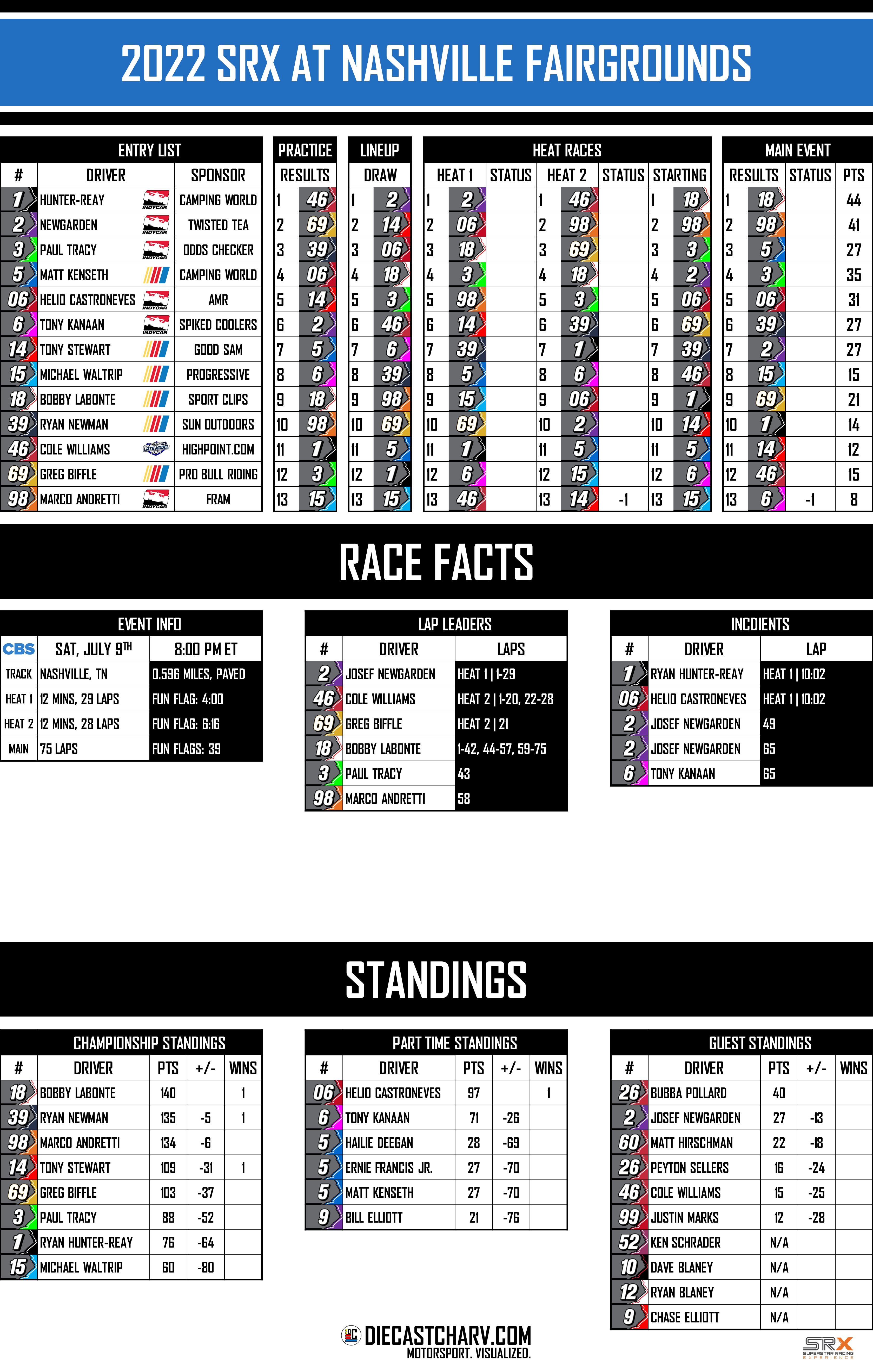 2022 SRX AT NASHVILLE FAIRGROUNDS PRACTICE SATURDAY, JULY 91:00 PM – 2:00 PM ET RACE SATURDAY, JULY 98:00PM ET ON CBS Share this: Share on X (Opens in new window) X Share on Facebook (Opens in new window) Facebook Share on Reddit (Opens in new window) Reddit Like Loading...