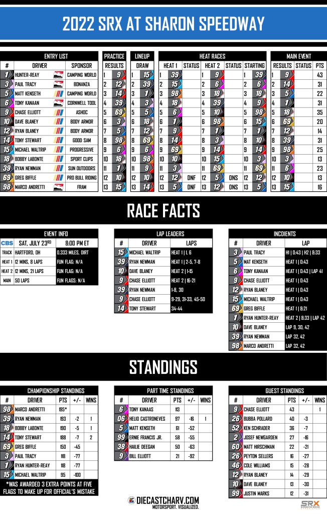 2022 SRX AT SHARON SPEEDWAY PRACTICE SATURDAY, JULY 233:00 PM – 4:00 PM ET RACE SATURDAY, JULY 238:00PM ET ON CBS Share this: Click to share on X (Opens in new window) X Click to share on Facebook (Opens in new window) Facebook Click to share on Reddit (Opens in new window) Reddit Like Loading...