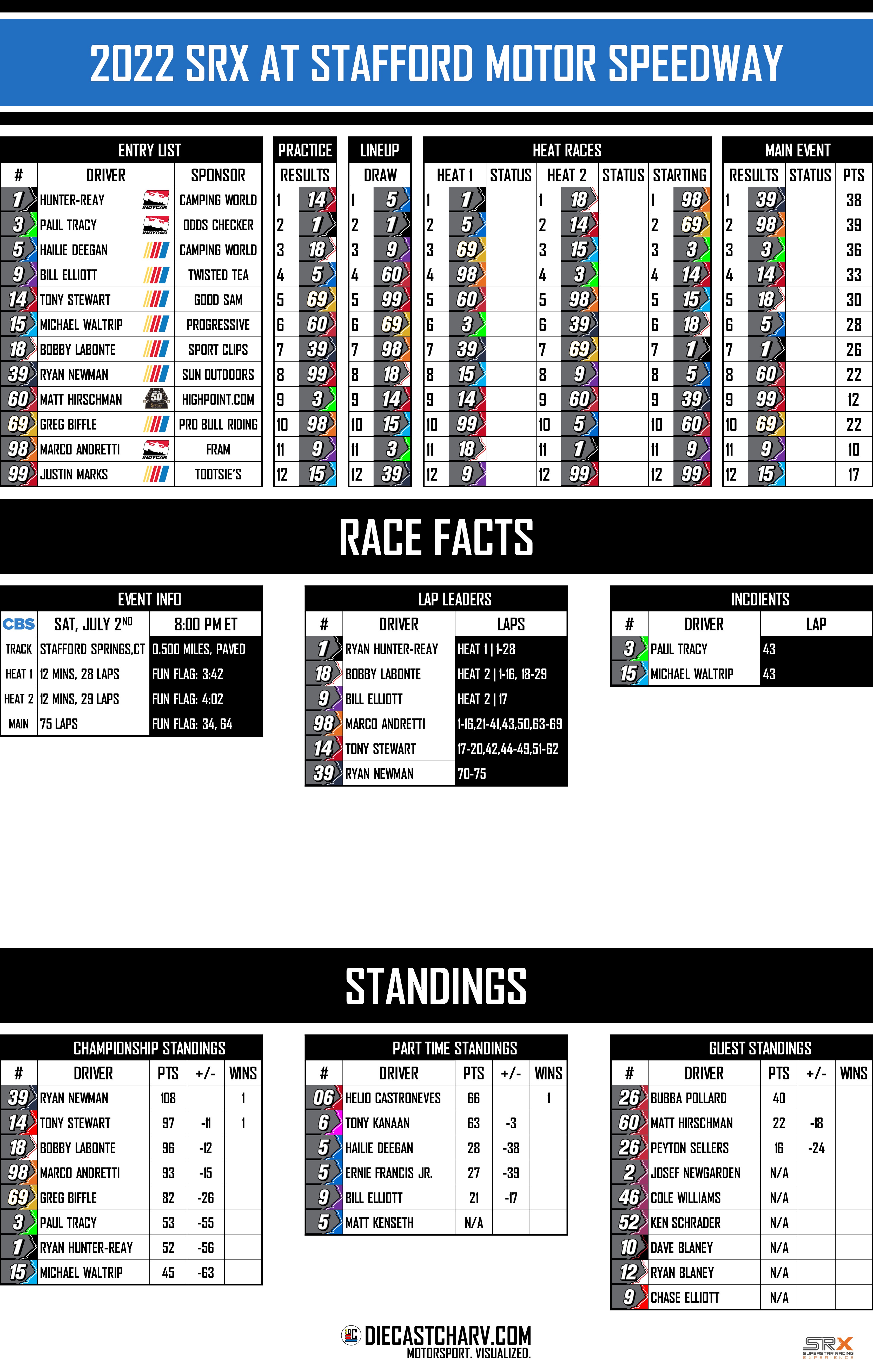 2022 SRX AT STAFFORD SPEEDWAY PRACTICE SATURDAY, JULY 212:00 PM – 1:00 PM ET RACE SATURDAY, JULY 28:00PM ET ON CBS Share this: Share on X (Opens in new window) X Share on Facebook (Opens in new window) Facebook Share on Reddit (Opens in new window) Reddit Like Loading...