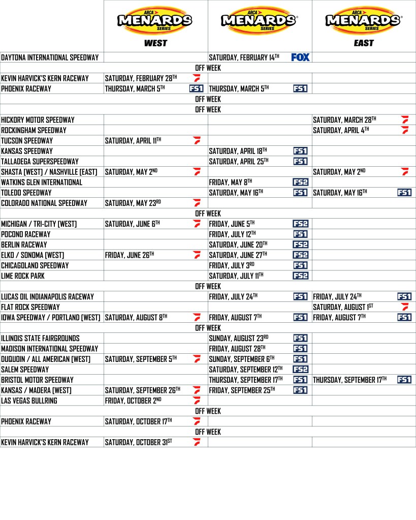 2026 ARCA SCHEDULES Share this: Click to share on X (Opens in new window) X Click to share on Facebook (Opens in new window) Facebook Click to share on Reddit (Opens in new window) Reddit Like Loading...